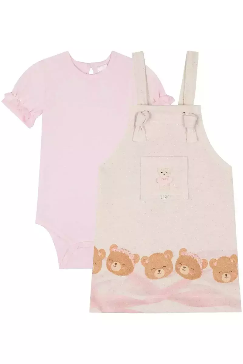 O Conjunto Kukie Baby é pura fofura e conforto para as pequenas. O body rosa, confeccionado em cotton, possui mangas com babados. A salopete, em moletom linho sem pelúcia (na cor bege/off-white), apresenta um patch de urso com aplicação de strass na parte superior e uma charmosa estampa de ursinhos com laços e strass na saia. Ideal para o dia a dia das bebês, combinando delicadeza e bem-estar.