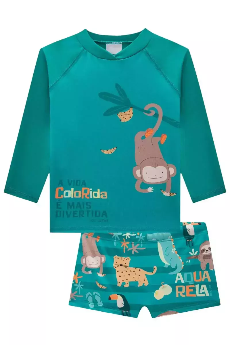 O conjunto de camiseta e sunga em malha UV dry com proteção UV 50+ da Luc.boo prepara os pequenos para aproveitar o sol com segurança e estilo. Ideal para praia, piscina e atividades ao ar livre. Disponível em uma cor super estilosa - verde - este conjunto oferece conforto, proteção e um toque divertido.