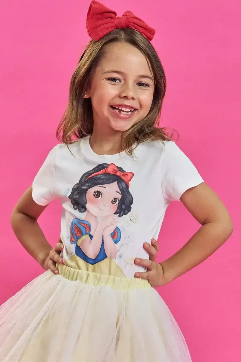 O Conjunto Kukie Branca de Neve é pura doçura e encanto — a blusa em meia malha off white traz a delicadeza da princesa mais querida da Disney, com estampa encantadora e toque macio que garante conforto o dia todo.
