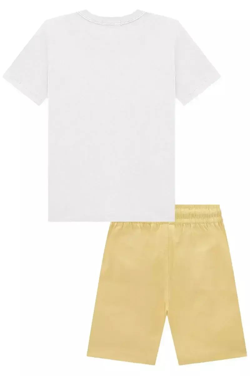 Confortável e cheio de estilo, o look combina camiseta em meia malha 100% algodão com bermuda em linho Santorine com elastano, garantindo leveza, frescor e liberdade para brincar à vontade.