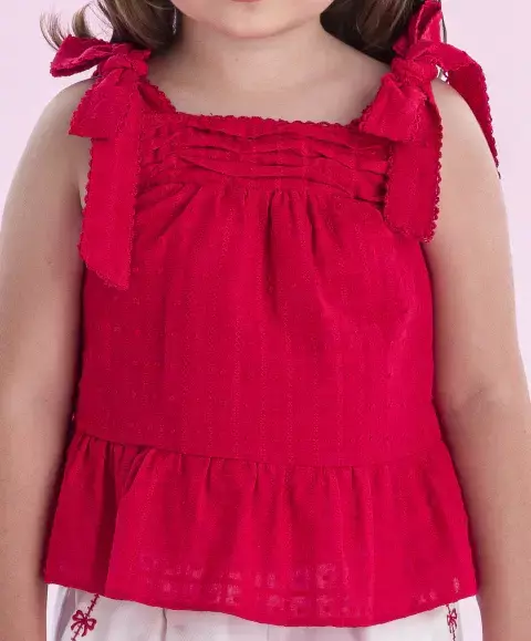 Prepare-se para ver sua pequena brilhar com este conjunto que une estilo, conforto e praticidade em cada pedacinho! A blusa vermelha em tecido maquinetado é puro charme, com alcinhas ajustáveis em laço que garantem o ajuste ideal e um visual encantador. O franzido no busto e o babado delicado na barra trazem aquele toque romântico que derrete corações.