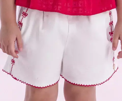 O shorts branco em sarja completa o look com perfeição: acabamento em ponto palito vermelho, bordadinhos laterais e laços fofos que fazem toda diferença. Com cós de elástico, bolsos funcionais e barra scalloped, ele garante liberdade total para brincar, correr e se divertir — tudo com elegância e leveza.