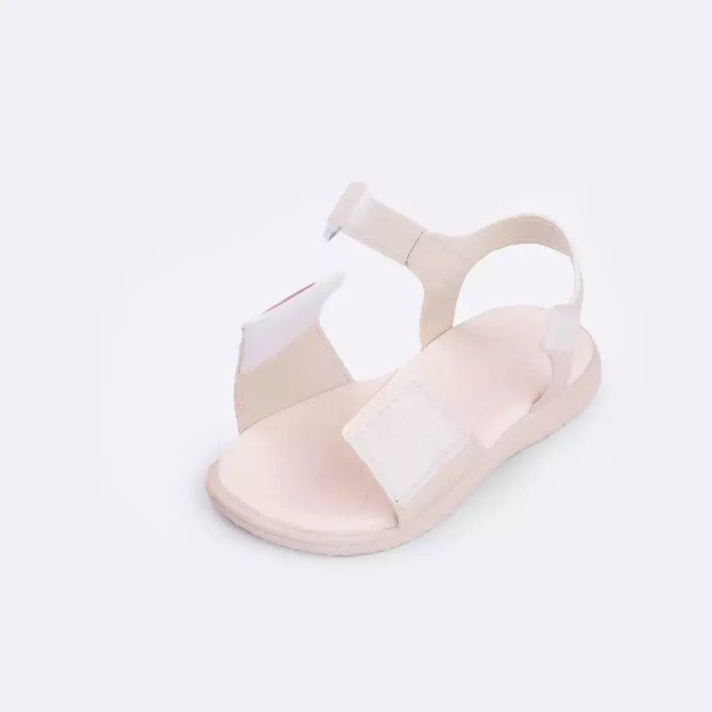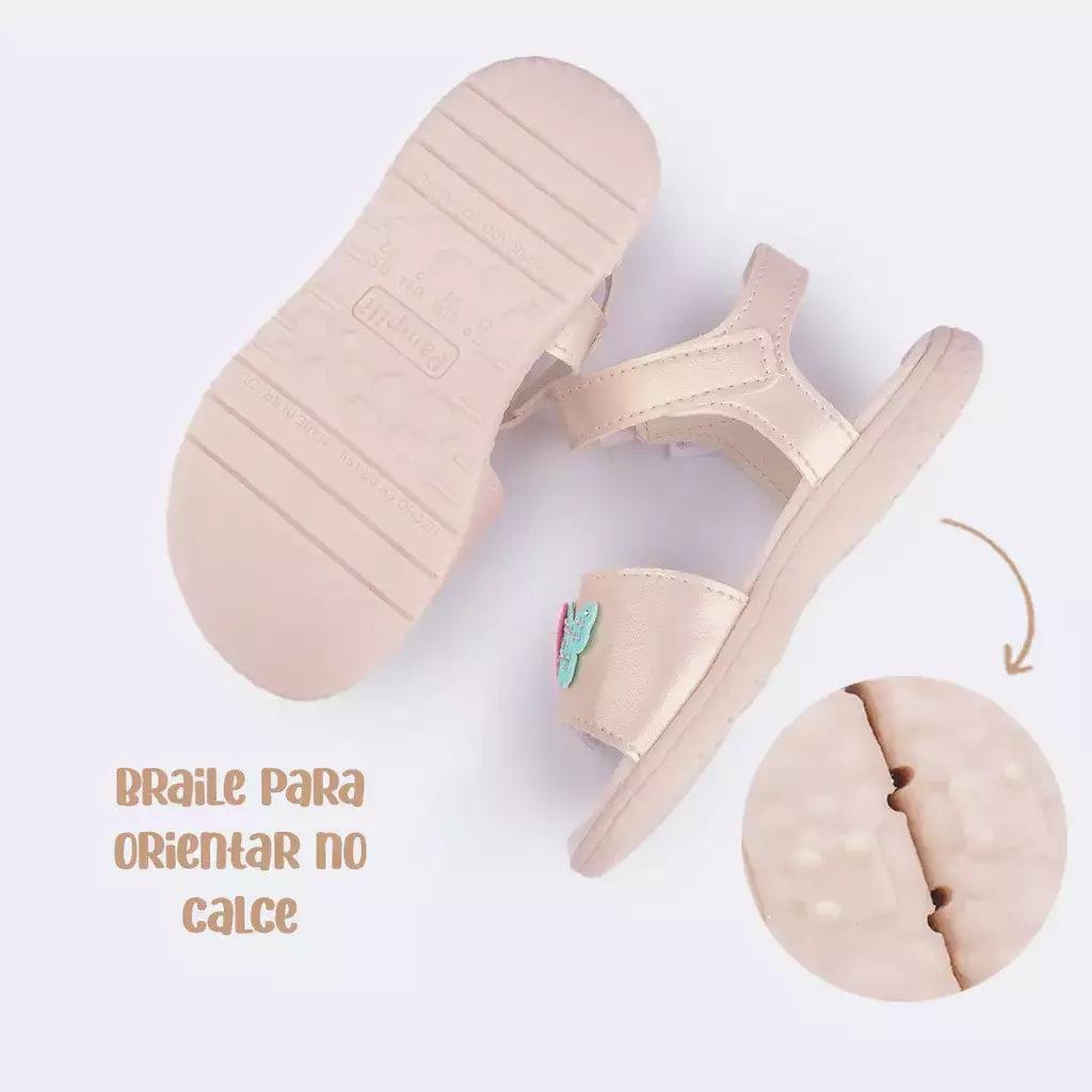 Sandália infantil com fechamento através de fita aderente para maior praticidade e autonomia da menina! A sandália vem com escrita em braile nas laterais, mostrando o lado correto para as meninas cegas ou com baixa visão.