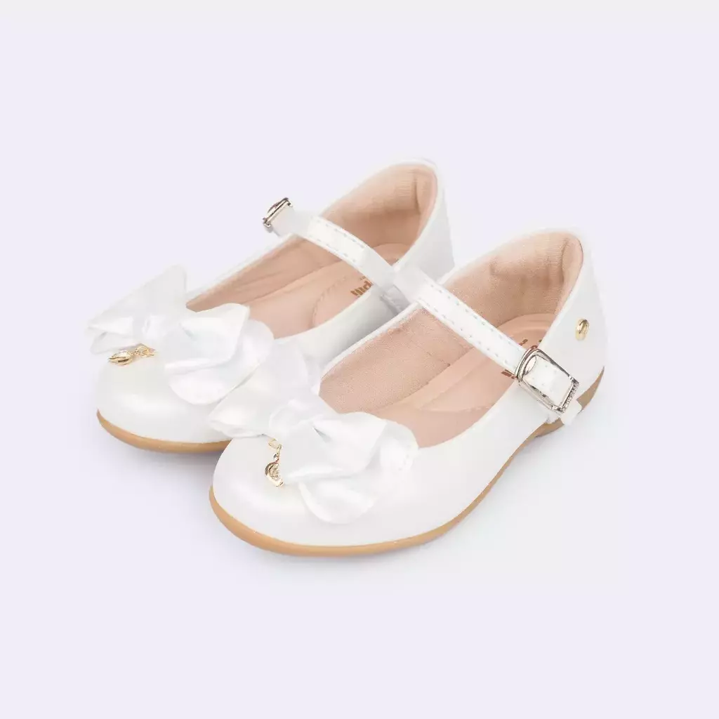 Delicado e encantador, este sapato infantil branco é aquele item especial que transforma qualquer visual! Com bico arredondado, laço estruturado no cabedal e um mini pingente de coração pendurado no laço, trás detalhes adoráveis e cheio de ternura.