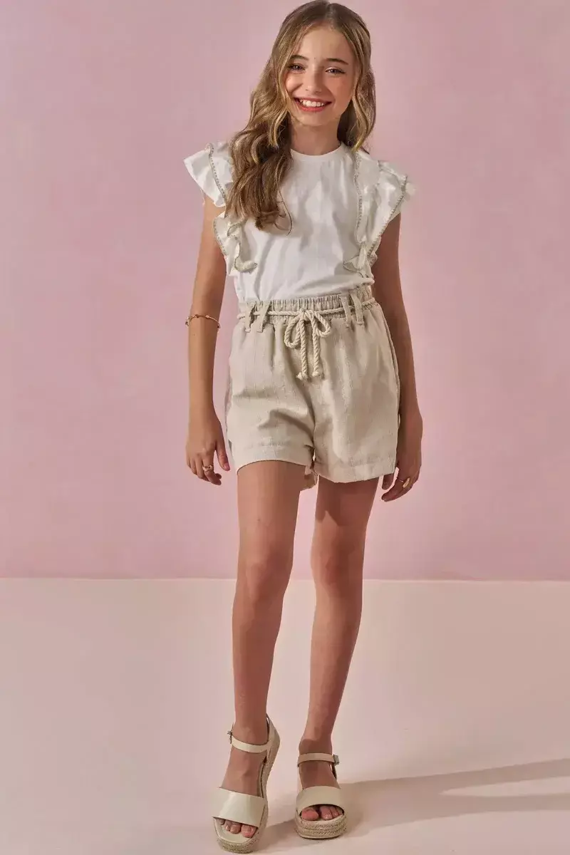 O Shorts em Linho Milano é uma peça delicada e cheia de charme, perfeita para as meninas que amam estilo e conforto em um look só!