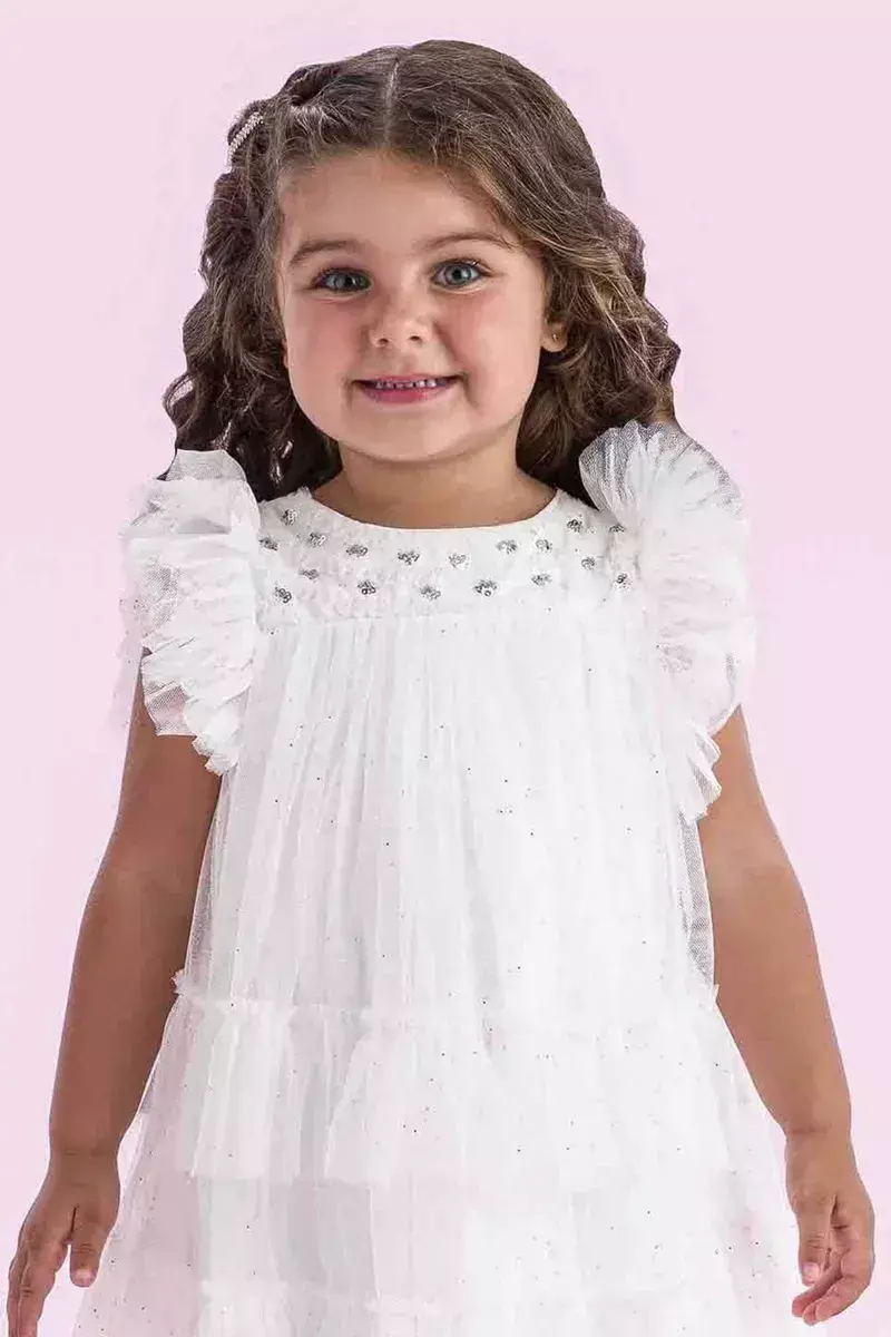 O Vestido Infantil Petit Cherie é puro encanto e elegância para momentos especiais. Confeccionado em tule leve com delicado brilho, ele encanta pelos babados em camadas, que criam um movimento suave e sofisticado a cada passo. O bordado delicado no decote e os babadinhos nos ombros trazem um toque romântico e cheio de ternura.